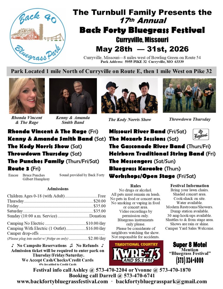 17th Annual Back Forty Bluegrass Festival Flyer-May 28th-31st, 2026 Posted byAshley TurnbullFebruary 4, 2026Posted inUncategorized Share this: Share on X (Opens in new window) X Share on Facebook (Opens in new window) Facebook Like Loading... Related